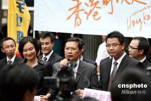 七月十七日,香港民建聯(lián)在遮打花園造勢,向傳媒介紹二十九位參加九月的立法會(huì)地區(qū)直選的參選人。香港民建聯(lián)主席譚耀宗表示,希望在九月的立法會(huì)選舉中,能保持十二個(gè)席位的數(shù)目。中新社發(fā) 洪少葵 攝