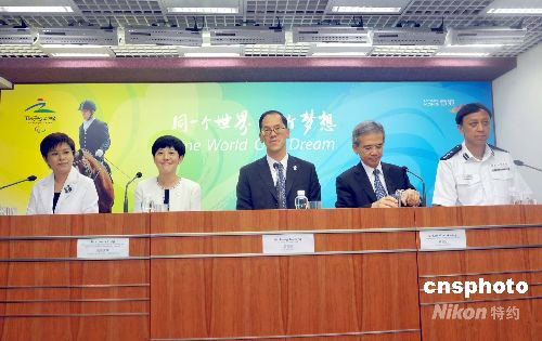 九月二日,香港特區(qū)政府就北京二零零八年殘奧馬術(shù)比賽項目的準(zhǔn)備工作舉行記者會,香港民政事務(wù)局局長曾德成、奧運(yùn)馬術(shù)公司行政總裁林煥光、香港殘疾人奧委會暨傷殘人士體育協(xié)會主席馮馬潔嫻、運(yùn)輸署助理署長(新界)羅鳳屏和警察公共關(guān)系科總警司吳家聲向媒體公布相關(guān)事宜。中新社發(fā) 鄧慶樂 攝