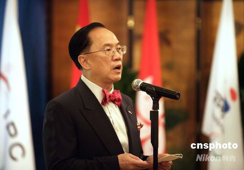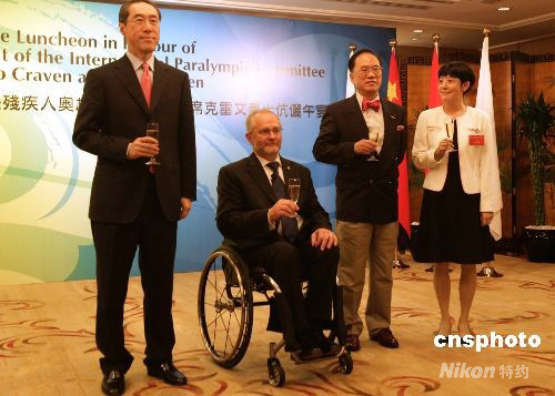 九月十日,香港行政長(zhǎng)官曾蔭權(quán)在酒店舉行午宴,歡迎殘奧委員會(huì)主席克雷文爵士訪港。午宴前曾蔭權(quán)、克雷文爵士在歡迎午宴上分別致辭。 中新社發(fā) 張勤 攝