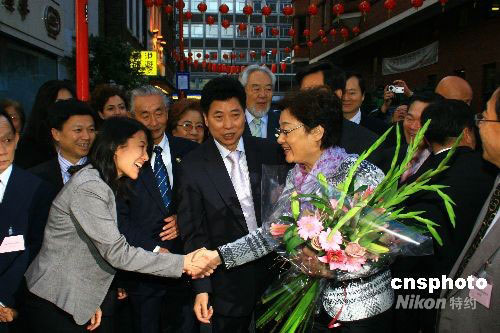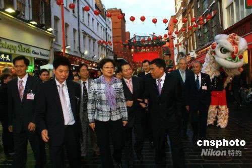 當(dāng)?shù)貢r間9月12日傍晚,中國國務(wù)院僑辦主任李海峰一行在倫敦唐人街參觀訪問,在華人僑領(lǐng)的陪同下參觀唐人街。中新社發(fā) 李鵬 攝