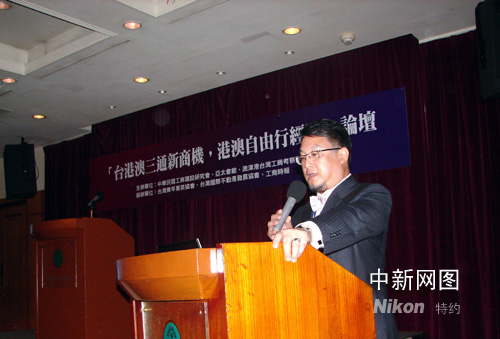 圖為澳門物流貨運(yùn)聯(lián)合商會(huì)理事長(zhǎng)李國(guó)輝向臺(tái)灣業(yè)界介紹內(nèi)地開(kāi)放自由行后對(duì)促進(jìn)澳門物流零售業(yè)的幫助及相應(yīng)的運(yùn)營(yíng)經(jīng)驗(yàn)。