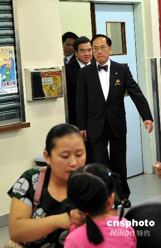 香港特區(qū)行政長官曾蔭權(quán)二十三日下午,前往油麻地賽馬會分科診所,了解受三聚氰胺奶品事件影響兒童的檢驗(yàn)情況。中新社發(fā) 譚達(dá)明 攝