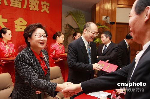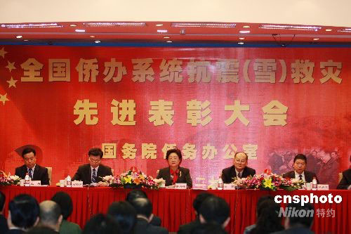 9月28日,國務(wù)院僑辦在北京召開僑辦系統(tǒng)抗震(雪)救災(zāi)先進(jìn)表彰電視電話會(huì)議,對(duì)全國僑辦系統(tǒng)在抗震(雪)救災(zāi)斗爭中表現(xiàn)突出的50個(gè)先進(jìn)集體和100名先進(jìn)個(gè)人予以表彰。中新社發(fā) 鄭雄增 攝