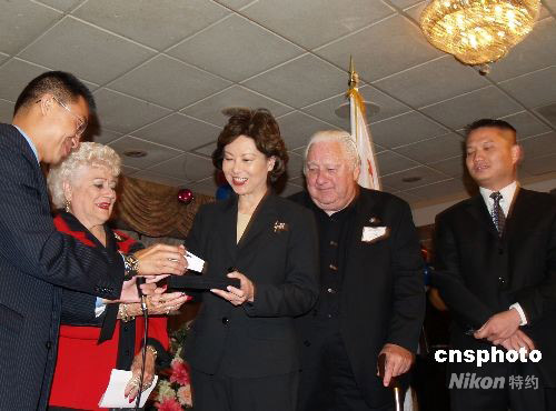 當(dāng)?shù)貢r(shí)間9月29日,美國勞工部長趙小蘭到洛杉磯向亞裔民眾說明美國經(jīng)濟(jì)低迷“解套”辦法,為民眾打氣。加州眾議員陳文、核桃市議員林恩成、鉆石吧市議員張文彬等華人民選官員陪同參加。圖為華人代表向美國勞工部長趙小蘭贈送紀(jì)念品。 中新社發(fā) 盧威 攝