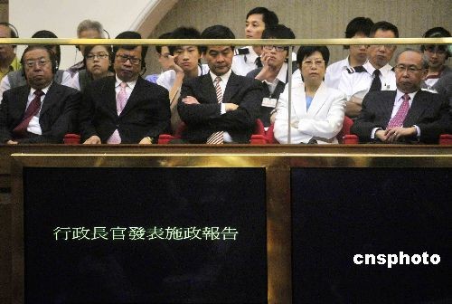 十月十五日,香港行政長官曾蔭權(quán),在立法會發(fā)表二零零八至零九年施政報告。特首夫人曾鮑笑薇及多位行政會議成員出席旁聽。中新社發(fā) 譚達(dá)明 攝