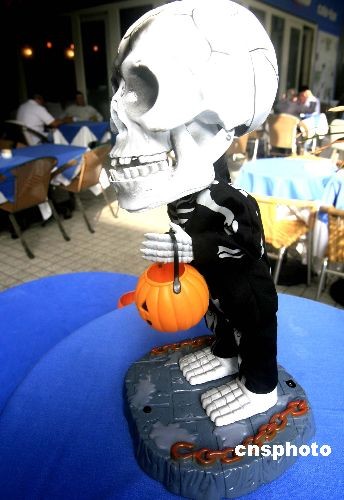 十月三十一日傍晚,香港一家酒吧為迎接前來(lái)歡度“萬(wàn)圣節(jié)”的中外游客,特意在門(mén)外安裝“鬼燈”。中新社發(fā) 張勤 攝