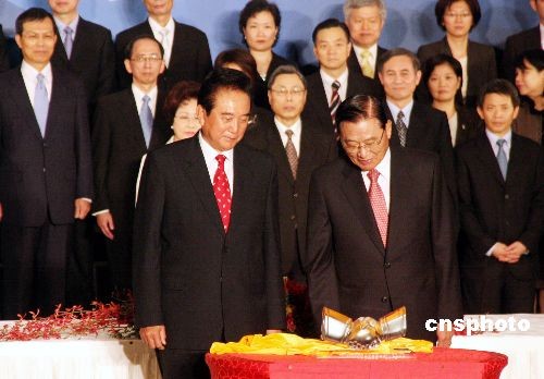 11月4日下午,海協(xié)會會長陳云林和海基會董事長江丙坤簽署有關(guān)兩岸空運直航、海運直航、郵政、食品安全的4項協(xié)議。圖為協(xié)議文本簽署后,陳云林向江丙坤致贈水晶作品《握手》。中新社發(fā) 黃少華 攝