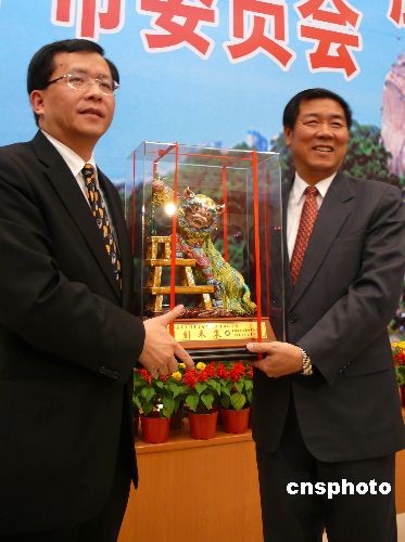 12月1日,中國國民黨臺(tái)中市委員會(huì)主委張逸華(左)率領(lǐng)參訪團(tuán)一行23人蒞廈參訪。這是國共兩黨展開基層黨務(wù)交流以來廈門與臺(tái)中市之間第3次互訪。圖為中共廈門市委書記何立峰(右)會(huì)見海峽彼岸貴賓之后雙方互贈(zèng)禮物。中新社發(fā) 楊伏山 攝