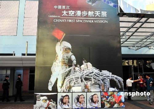 “中國(guó)首次太空漫步航天展”將于十二月六至十五日在香港科學(xué)館舉行。展覽將介紹中國(guó)載人航天工程,以及今年順利完成出艙任務(wù)的神舟七號(hào)宇宙飛船及航天員;主要展品則包括神舟七號(hào)宇宙飛船的返回艙、航天服、航天員出艙后所展示的國(guó)旗,以及近百幀珍貴的相關(guān)圖片。圖為巨幅宣傳海報(bào)在科技館門前展示。中新社發(fā) 譚達(dá)明 攝