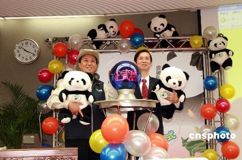 大陸贈臺大熊貓“團團”、“圓圓”即將來臺,臺北市立動物園12月5日開通專門網(wǎng)站“臺北大熊貓保育網(wǎng)”。圖為臺北市立動物園園長葉杰生(左)和臺北市教育局局長吳清山一起啟動網(wǎng)站。中新社發(fā) 周兆軍 攝