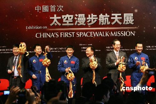 十二月六日,“中國首次太空漫步航天展”在香港科學(xué)館揭幕,神舟七號返回艙、航天服和航天員出艙后所展示的國旗等珍貴展品和圖片在展會上亮相。香港特區(qū)政府政務(wù)司司長唐英年、神舟七號載人航天飛行赴港代表團(tuán)團(tuán)長暨中國載人航天工程副總指揮張建啟、神七航天員翟志剛、劉伯明、景海鵬等出席揭幕儀式。中新社發(fā) 武仲林 攝