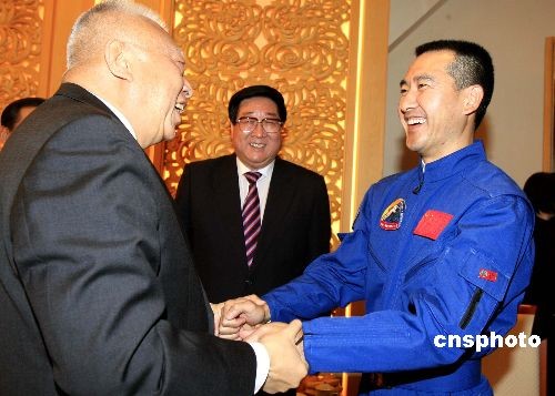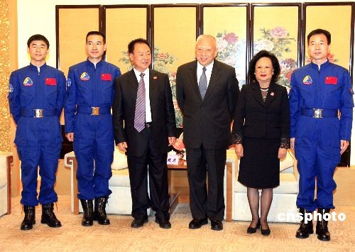十二月六日,全國(guó)政協(xié)副主席董建華在中央人民政府駐香港聯(lián)絡(luò)辦公室會(huì)見(jiàn)“神舟七號(hào)”載人航天飛行代表團(tuán)一行,并與代表團(tuán)團(tuán)長(zhǎng)及三名航天員合影留念。中新社發(fā) 張勤 攝