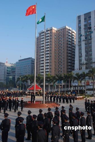 12月20日8時,澳門特區(qū)政府在金蓮花廣場舉行隆重的升旗儀式,慶祝澳門回歸祖國9周年。中新社發(fā) 畢永光 攝