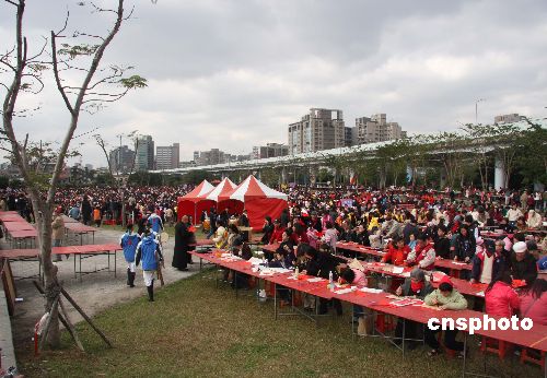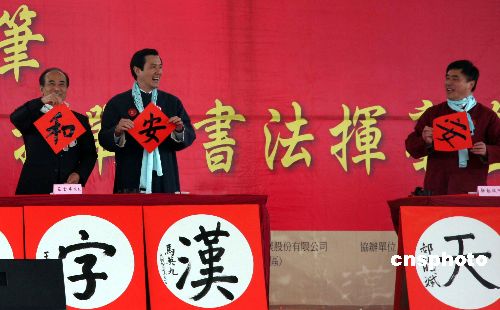 臺(tái)北市政府主辦的第五屆“漢字文化節(jié)”于二〇〇九年的第一天在臺(tái)北中央藝文公園舉行,吸引了一萬二千多民眾共揮毫迎新年。圖為臺(tái)灣地區(qū)領(lǐng)導(dǎo)人馬英九,臺(tái)灣立法機(jī)構(gòu)負(fù)責(zé)人王金平和臺(tái)北市長(zhǎng)郝龍斌等各界人士共同揮毫為新年祈福。中新社發(fā) 路梅 攝