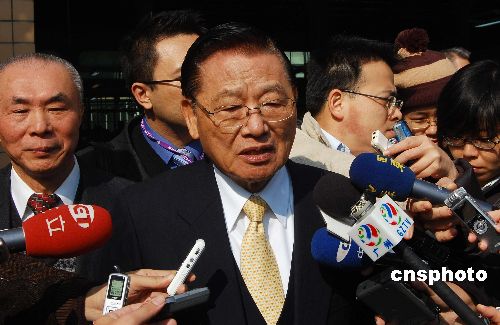 一月九日上午,海協(xié)會與海基會聯(lián)合參訪團在廣州考察一家臺資企業(yè)。考察結束后,臺灣;鶗麻L江丙坤接受兩岸記者聯(lián)合采訪。中新社發(fā) 柯小軍 攝