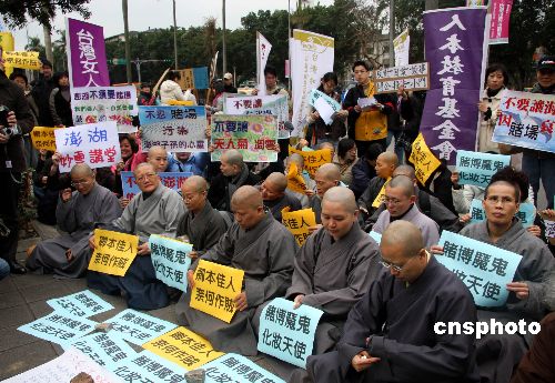 1月12日,臺(tái)灣“立法院”將表決離島建設(shè)條例部分條文修正草案,即博弈條款。圖為約百名反賭博合法化聯(lián)盟的成員,當(dāng)天上午到“立法院”門口陳情抗議,表達(dá)反賭博合法化立場。中新社發(fā) 陳立宇 攝