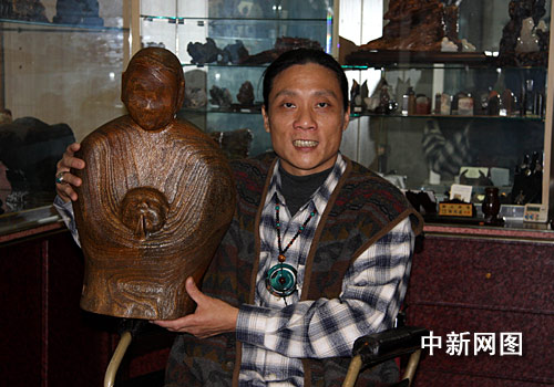 臺(tái)灣知名殘障木雕家林正發(fā),年青時(shí)不幸因車禍而不良于行。但并沒(méi)因此喪志。反而一心致力于木雕藝術(shù)的創(chuàng)作。成為一個(gè)自食其力的人。曾多次獲臺(tái)灣木雕比賽大獎(jiǎng)。圖為林正發(fā)和他的新作“佑”。以抽象的藝術(shù)手法來(lái)表現(xiàn)虔誠(chéng)的宗教觀念。