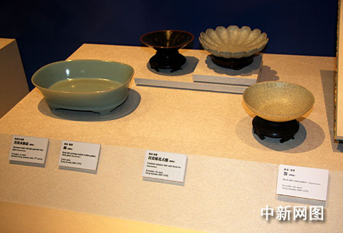 近日,為推廣臺(tái)北故宮“周末夜”活動(dòng),臺(tái)北故宮博物院在臺(tái)北火車(chē)站設(shè)置長(zhǎng)箱型玻璃廣告廊,以高仿真度的館藏文物進(jìn)行宣介。圖為展示的仿宋代汝窯、建窯、哥窯瓷器。 中新社記者 陳立宇 攝