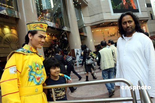 二月十九日,“香港電影百年展”在時(shí)代廣場舉行,展覽內(nèi)容包括香港電影業(yè)百年間的發(fā)展歷史、早期的電影海報(bào)、明星相及廣告。圖為古裝扮相的演員與游客同樂。中新社發(fā) 洪少葵 攝