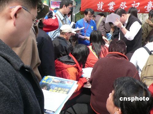大環(huán)境經(jīng)濟(jì)不景氣,臺(tái)灣去年十二月失業(yè)率超過百分之五,失業(yè)人口近五十無萬!爸饔(jì)處”對(duì)今年經(jīng)濟(jì)成長(zhǎng)率的預(yù)測(cè)為負(fù)百分之二點(diǎn)九七。臺(tái)北市政府勞工局在二十一日舉行了一場(chǎng)就業(yè)博覽會(huì),釋出兩千多個(gè)工作職位,并提供職業(yè)訓(xùn)練課程供民眾申請(qǐng)。中新社發(fā) 路梅 攝