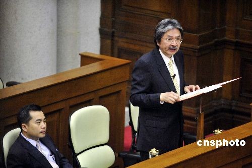二月二十五日,香港特區(qū)財(cái)政司司長(zhǎng)曾俊華在立法會(huì)大樓會(huì)議廳向立法會(huì)提交二零零九至二零一零年度財(cái)政預(yù)算案。中新社發(fā) 譚達(dá)明 攝