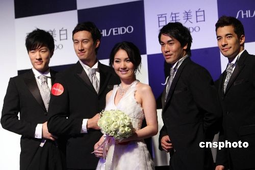三月二日,香港天后級(jí)歌星楊千嬅為日本某著名美容品牌擔(dān)任形象大使。圖為悉心打扮的楊千嬅在一眾型男模特的襯托下,靚麗登場。中新社發(fā) 洪少葵 攝