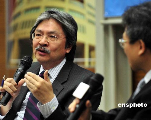 三月三日,香港特區(qū)財政司司長曾俊華,在浸會大學(xué)與學(xué)生舉行座談會,討論財政預(yù)算案。中新社發(fā) 譚達(dá)明 攝