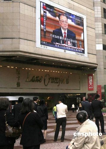 三月五日上午,香港市民在時代廣場通過大屏幕收看國務(wù)院總理溫家寶在十一屆全國人大二次會議上作的《政府工作報告》。中新社發(fā) 張勤 攝