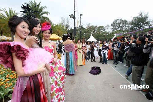 三月十二日,應(yīng)屆香港小姐陳倩揚(yáng)、高海寧、馬賽盛裝打扮,在香港維園花展內(nèi)為“萬花喜迎東亞運(yùn)”攝影比賽當(dāng)日造型模特,活動吸引數(shù)百影友入場拍攝。中新社發(fā) 洪少葵 攝