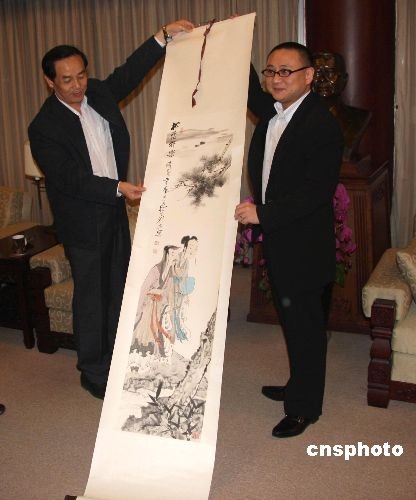 三月二十五日,由十七家大陸中央媒體負(fù)責(zé)人組成的訪問團(tuán)拜訪臺(tái)灣《聯(lián)合報(bào)》。圖為訪問團(tuán)團(tuán)長、《人民日?qǐng)?bào)》總編輯吳恒權(quán)(左)向《聯(lián)合報(bào)》贈(zèng)送禮品。中新社發(fā) 耿軍 攝