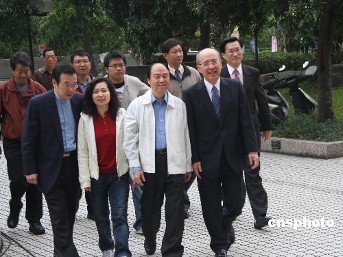 臺(tái)北市大安區(qū)立委補(bǔ)選三月二十八日投票。大安區(qū)具投票資格人數(shù)為二十四萬一千四百多人人,總計(jì)在大安區(qū)的五十二個(gè)里設(shè)有一百六十三個(gè)投開票所。上午九時(shí)中國(guó)國(guó)民黨候選人蔣乃辛(前排右二)在黨主席吳伯雄(前排右一)、國(guó)民黨臺(tái)北市黨部主委潘家森陪同下,前往位于新生國(guó)小三年二班教室的投開票所投票。中新社發(fā) 耿軍 攝