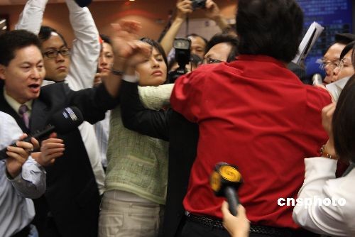 四月二十二日上午,臺灣“立法院內(nèi)政委員會(huì)”邀請“陸委會(huì)”主委賴幸媛、海基會(huì)秘書長高孔廉等人報(bào)告即將舉行的第三次“陳江會(huì)談”。據(jù)臺灣中央社報(bào)道:中國國民黨籍“立委”李慶華在進(jìn)行程序發(fā)言時(shí),民進(jìn)黨籍“立委”邱議瑩在臺下表達(dá)不滿意見,引發(fā)李慶華不滿,要邱議瑩“有點(diǎn)家教”,邱議瑩(左四穿白衣女性)與李慶華(穿紅衣男性)爆發(fā)口角,并突然從后面打李慶華一巴掌。李慶華下午到臺北地檢署,按鈴控告邱議瑩傷害及公然侮辱罪。圖為本社記者在“立法院”采訪時(shí)拍攝到的情景。中新社發(fā) 耿軍 攝