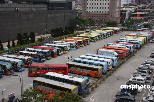 從今年三月起,到臺(tái)灣的大陸游客驟增,日抵人數(shù)甚至突破七千人。以大陸游客在臺(tái)灣停留六至十天計(jì),每天停留在臺(tái)灣的大陸游客有數(shù)萬人,以致游覽車不夠用。圖為在大陸游客參觀點(diǎn)臺(tái)北101大樓的附近停車場(chǎng)停滿旅游團(tuán)車輛。臺(tái)灣觀光局四月二十六日緊急研商決定,供大陸游客使用的游覽車車齡由七年放寬到十年,以增加一千三百六十輛游覽車緩解車輛不足。中新社發(fā) 耿軍 攝
