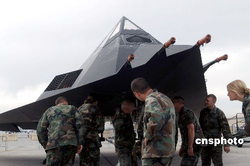 美國為紀(jì)念六十年前成立空軍,十一月在內(nèi)華達(dá)州的內(nèi)利斯空軍基地舉辦大規(guī)模飛機展示,美軍人員貼身參觀世界上第一種可正式作戰(zhàn)的隱型戰(zhàn)斗機F-117A“夜鷹”,此極專門用于夜間攻擊。中新社發(fā) 賈國榮 攝