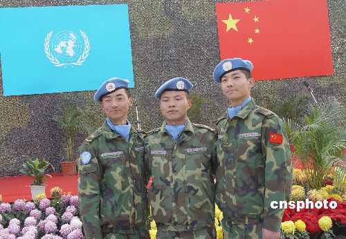 二十三日下午,國(guó)防部、濟(jì)南軍區(qū)在鄭州新鄭國(guó)際機(jī)場(chǎng)舉行儀式,為中國(guó)赴蘇丹達(dá)爾富爾維和工兵先遣分隊(duì)一百三十五名官兵送行。按照行程,這支維和部隊(duì)將于二十三日晚間二十一時(shí)許登機(jī),飛往萬里之外的異國(guó)他鄉(xiāng)執(zhí)行維和任務(wù)。圖為維和官兵在中國(guó)、聯(lián)合國(guó)國(guó)旗下合影。中新社發(fā) 李志全 攝
