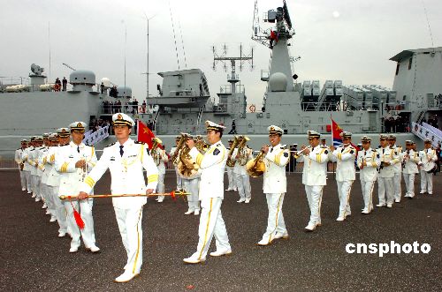 11月28日上午,中國海軍“深圳”號導(dǎo)彈驅(qū)逐艦抵達(dá)日本東京晴海碼頭,開始對日本進(jìn)行正式友好訪問。在日方舉行的歡迎儀式后,中國海軍軍樂團(tuán)在“深圳”號前進(jìn)行列隊(duì)表演。中新社發(fā) 滕劍峰 攝