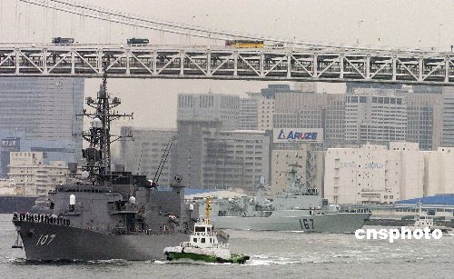 11月28日,中國海軍“深圳”號(舷號167)導彈驅(qū)逐艦在日本海上自衛(wèi)隊“雷”號護衛(wèi)艦的引導下如期抵達東京晴海碼頭,開始對日為期四天的友好訪問。這是中國海軍軍艦第一次訪問日本。中新社發(fā) 朱沿華 攝