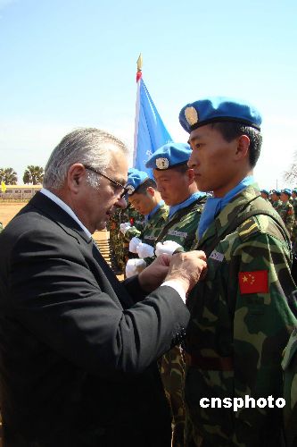 2月7日,聯(lián)合國駐蘇丹特派團(tuán)(聯(lián)蘇團(tuán))在中國的傳統(tǒng)節(jié)日--春節(jié)這一天舉行隆重的授勛儀式,破例提前兩個(gè)月為中國赴蘇丹瓦烏435名維和官兵授予聯(lián)合國“和平榮譽(yù)勛章”,以表彰他們?cè)趫?zhí)行任務(wù)時(shí)的卓越表現(xiàn)。聯(lián)合國秘書長駐蘇丹特別代表卡齊先生、聯(lián)蘇團(tuán)總司令里德爾中將從首都喀土穆趕來親自為維和官兵授勛并與官兵一起歡度春節(jié)。中新社發(fā) 甄玉改 攝