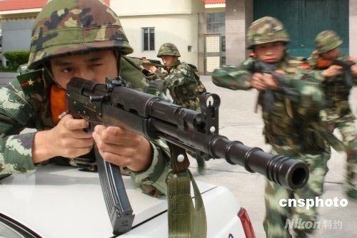 5月10日,武警福建總隊(duì)泉州支隊(duì)反恐分隊(duì)進(jìn)行了一場(chǎng)以?shī)W運(yùn)圣火受到干擾和遭到破壞為背景的實(shí)戰(zhàn)演練,為奧運(yùn)圣火在福建順利傳遞提供安全保障。圖為反恐分隊(duì)的武警官兵們正在進(jìn)行“反騷亂”演練。中新社發(fā) 張九強(qiáng) 攝