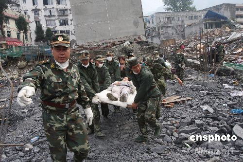 圖:武警官兵在汶川縣映秀鎮(zhèn)搶救傷員