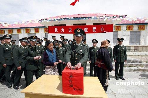 5月16日,駐守在海拔4500多米的西藏兵站部某大站黑河兵站官兵拿出津貼向四川災(zāi)區(qū)民眾獻(xiàn)上一份愛(ài)心。中新社發(fā) 樊厚東 攝