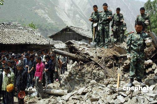 5月19日下午2點(diǎn)28分,武警汶川搶險(xiǎn)救災(zāi)官兵在救援現(xiàn)場(chǎng)向地震死難者默哀。中新社發(fā) 陳文 攝