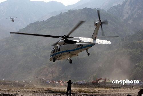 5月19日,中國空軍繼續(xù)高密度對(duì)四川省汶川大地震核心重災(zāi)區(qū)映秀鎮(zhèn)空運(yùn)救災(zāi)物資與部隊(duì)急需的飲用水等給養(yǎng)。雖然都江堰至映秀的“生命線公路”已經(jīng)打通,但是不斷的余震與降雨每天都會(huì)多次中斷車輛通行。中新社發(fā) 任晨鳴 攝