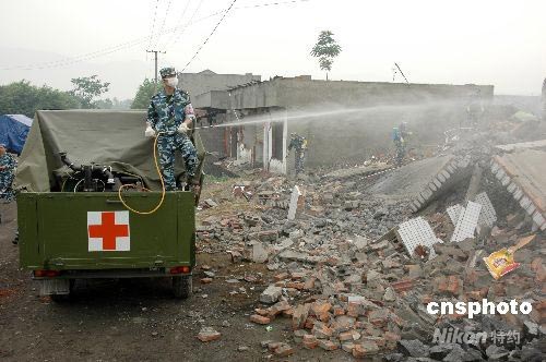 5月下旬,海軍衛(wèi)生防疫消殺突擊分隊的防疫車對四川地震災(zāi)區(qū)民房進(jìn)行預(yù)防性消毒。截至到5月30日上午,由86名專業(yè)隊員組成的衛(wèi)生防疫消殺突擊分隊已完成對四川綿竹、什邡等地震重災(zāi)區(qū)60多個市區(qū)街道、村莊的廢墟、房舍、疑似疫源地等場所進(jìn)行衛(wèi)生防疫和消毒殺菌,有效地控制了災(zāi)區(qū)的疫情隱患。中新社發(fā) 李唐 攝