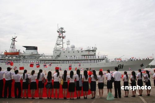 11月10日上午,泰國曼谷港口,載有400多名中國數(shù)所艦艇院校海軍官兵學(xué)員的“鄭和號”訓(xùn)練軍艦徐徐靠岸。據(jù)稱,這是中國海軍鄭和號軍艦第3次訪問泰國。中國駐泰國大使館張九桓大使、安作山武官和曼谷市政府官員、泰國海軍軍官學(xué)校代表、海軍外事處軍官以及泰國華人華僑、留學(xué)生代表100多人歡聚曼谷港口,熱情迎接中國海軍鄭和號訓(xùn)練軍艦再度訪泰。中新社發(fā) 顧時宏 攝
