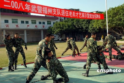 11月20日,武警福建福州支隊退伍兵專場招聘會在福州舉行。來自福州市的近20家用人單位來到招聘會現(xiàn)場,推出了微機(jī)操作、保安、公安戰(zhàn)線警務(wù)人員、物業(yè)、駕駛員、廚師等300多個工作崗位,供350多名即將退伍的老兵選擇。招聘會現(xiàn)場,退伍老兵通過軍事技能、電腦操作等才藝展示,面對面與用人單位溝通交流。中新社發(fā) 李濤 攝