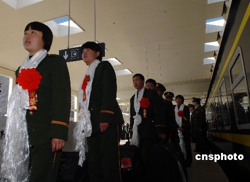 11月25日,駐藏某部及武警西藏森林總隊的退伍老兵們在戰(zhàn)友和拉薩當?shù)厝罕姷臍g送下踏上了回家的青鐵列車。從有關部門獲悉,拉薩火車站已經(jīng)為新老兵準備了充足的車輛和票額。另據(jù)了解,今年鐵路新老兵運輸將繼續(xù)執(zhí)行購票、行李托運、進出站和中轉(zhuǎn)換乘“四優(yōu)先”原則,為新老兵排憂解難、提供方便,確保新老兵乘車有票、上車有座,退伍老兵在旅客列車上用餐也將享受優(yōu)惠。 中新社發(fā) 龍昊 攝