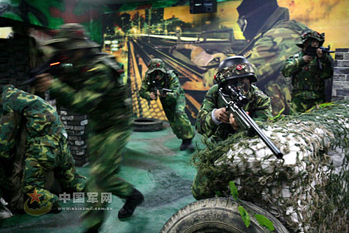 “Go,Go,Go!”12月2日下午, 一場激烈的“戰(zhàn)斗”對決在一塊特殊的陣地上進行!皯(zhàn)場”上矮墻林立、沙包堆積、枯樹橫亙,周圍則“炮火”連天,上空“飛機”盤旋……。戰(zhàn)士們身著作戰(zhàn)服,手持仿真槍,頭戴裝有感應器的頭盔,在時明時暗的“夜空”下穿梭,尋找目標,激烈對抗。這是某炮兵團日前建成的真人CS對抗陣地上的精彩一幕。據(jù)前來觀摩的總部領導介紹,實施真人CS對抗練兵在我軍部隊還是首家。