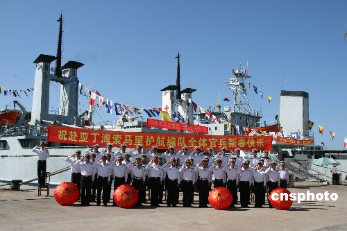 春節(jié)前夕(1月21日),遠(yuǎn)赴亞丁灣執(zhí)行護(hù)航任務(wù)的“微山湖”艦所在的南海艦隊(duì)某勤務(wù)船大隊(duì)官兵,打出橫幅,祝福全體護(hù)航官兵新春快樂,向他們拜早年,并向他們致以崇高的軍禮。中新社發(fā) 劉林 攝