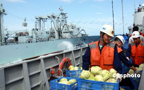 春節(jié)前夕,中國海軍艦艇編隊“?凇碧枌(dǎo)彈驅(qū)逐艦與“微山湖”號綜合補給艦完成一次海上補給,圖為“海口”艦官兵搬運補給到艦上的“年貨”。中新社發(fā) 孫自法 攝